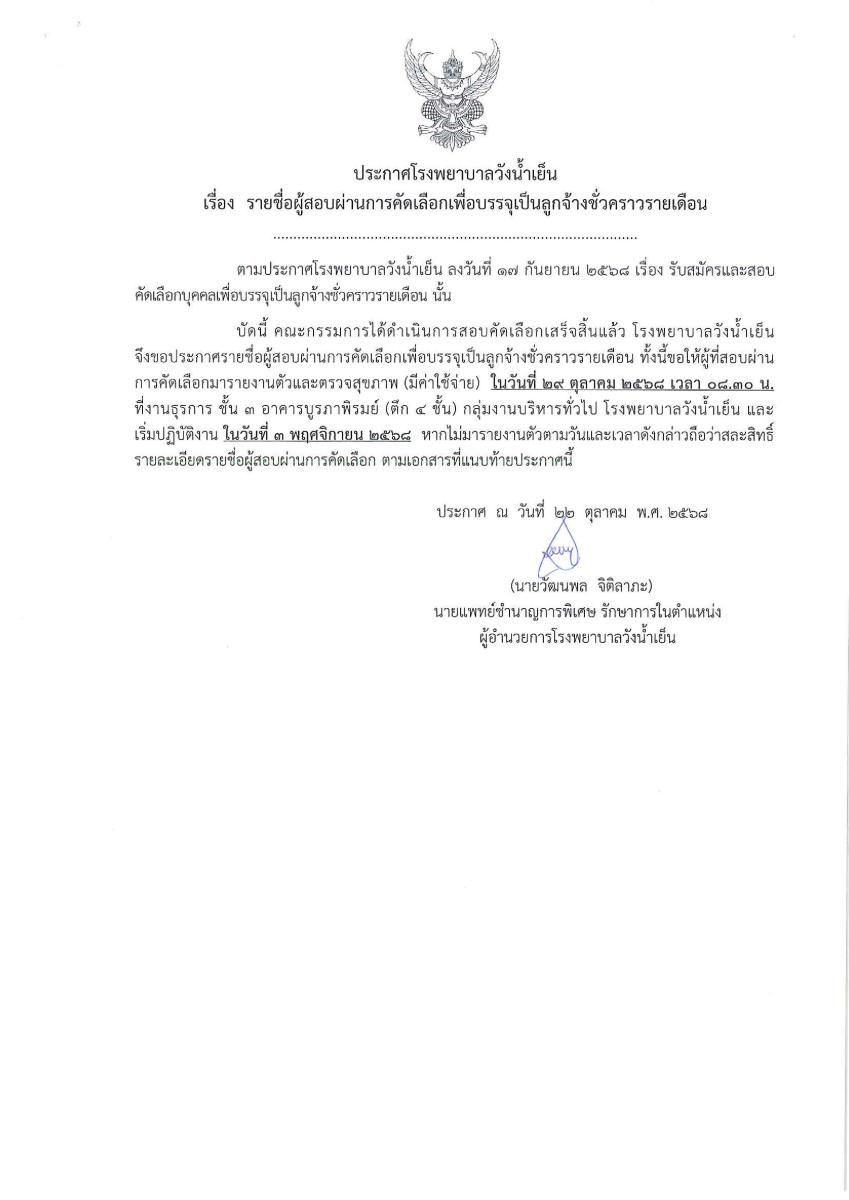 ทั้งนี้ขอให้ผู้สอบผ่านการคัดเลือกที่เป็น "ตัวจริง" เท่านั้น มารายงานตัวเพื่อตรวจสุขภาพ ในวันที่ 29 ตุลาคม 2568 เวลา 08.30 น. ที่งานธุรการ อาคารผู้ป่วยนอก ชั้น 3