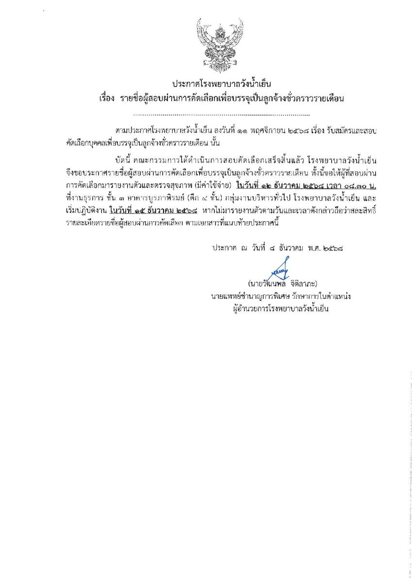 ทั้งนี้ขอให้ผู้สอบผ่านการคัดเลือกที่เป็น "ตัวจริง" เท่านั้น มารายงานตัวเพื่อตรวจสุขภาพ ในวันที่ 12 ธันวาคม 2568 เวลา 08.30 น. ที่งานธุรการ อาคารผู้ป่วยนอก ชั้น 3