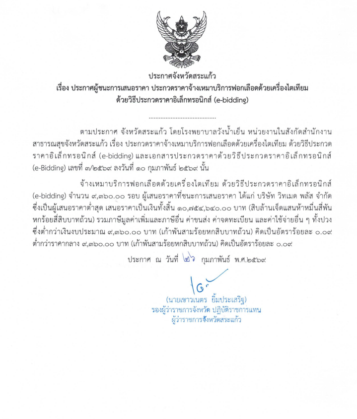 ประกาศผู้ชนะการเสนอราคา ประกวดราคาจ้างเหมาบริการฟอกเลือดด้วยเครื่องไตเทียม ด้วยวิธีประกวด ราคาอิเล็กทรอนิกส์ (e-bidding)