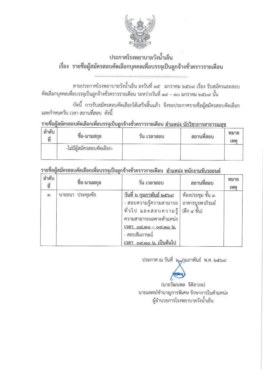 ประกาศโรงพยาบาลวังน้ำเย็น