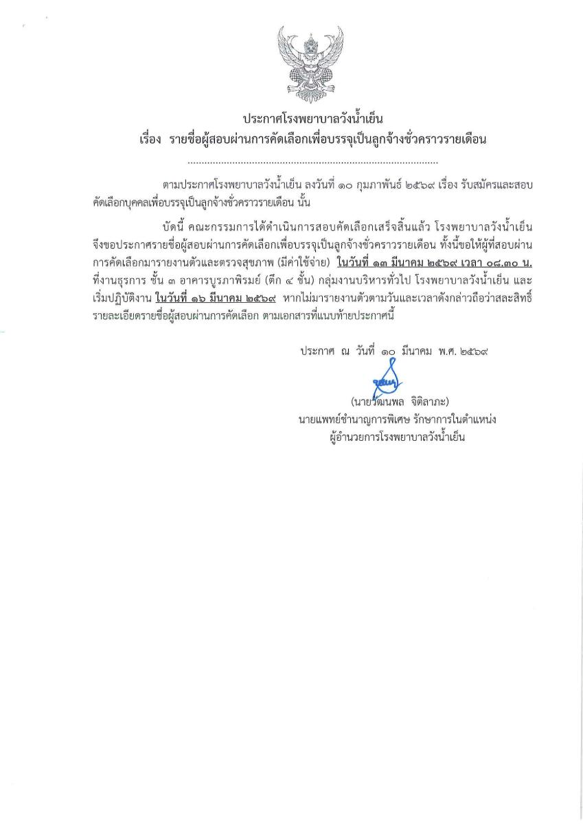 ทั้งนี้ขอให้ผู้สอบผ่านการคัดเลือกที่เป็น "ตัวจริง" เท่านั้น มารายงานตัวเพื่อตรวจสุขภาพ ในวันที่ 13 มีนาคม 2569 เวลา 08.30 น. ที่งานธุรการ อาคารผู้ป่วยนอก ชั้น 3